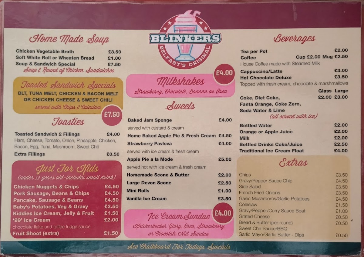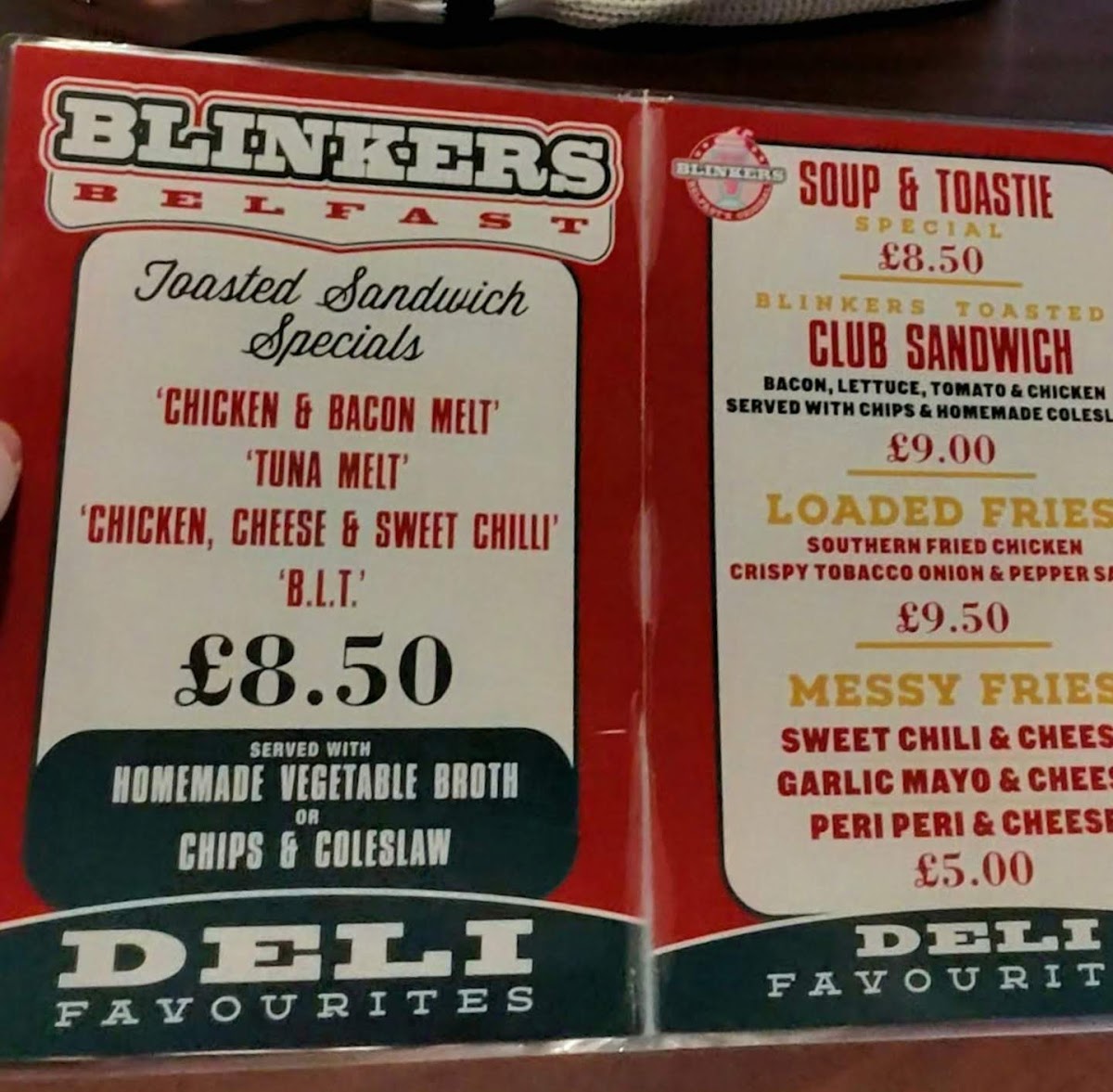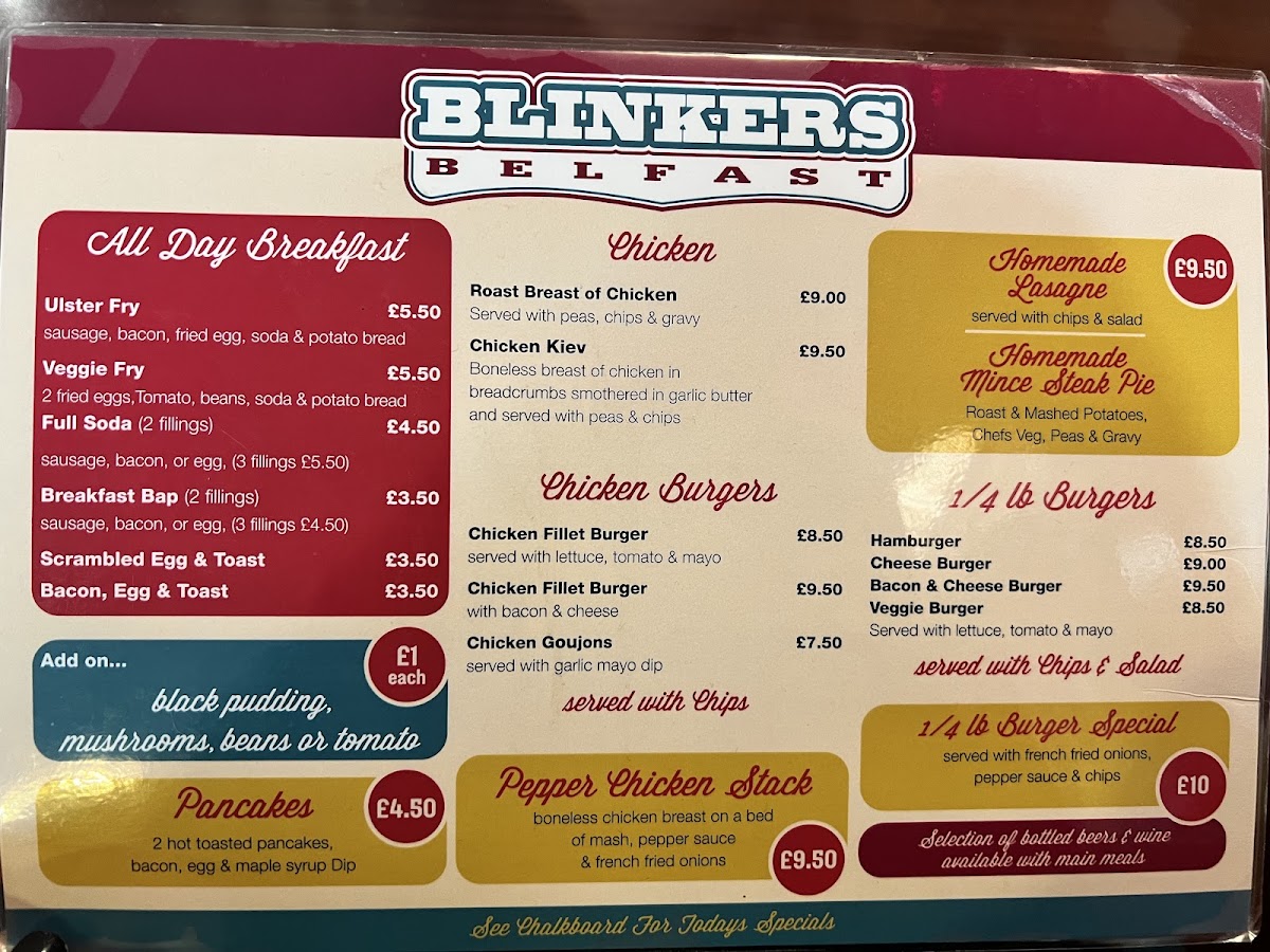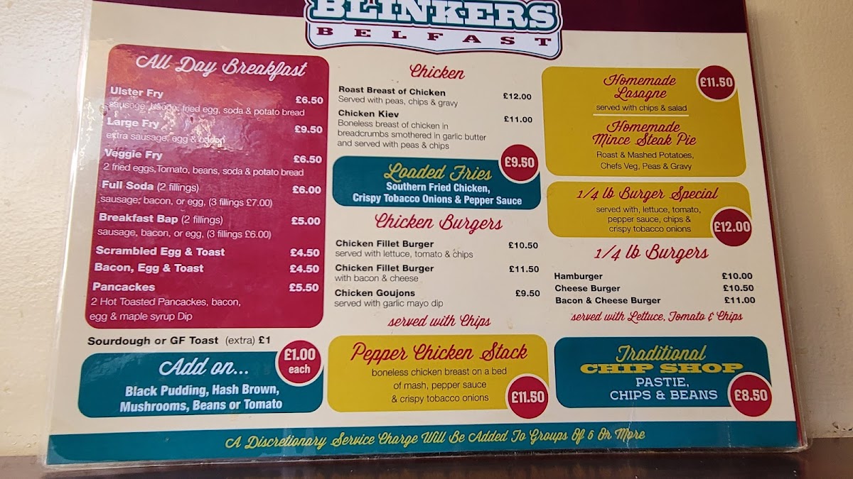 The menu at Blinkers offers a straightforward café-style experience, focusing on comforting, familiar dishes that suit any time of day. Whether you’re dropping in for a hearty breakfast, a casual lunch, or a warming snack, the selection features classic café fare alongside traditional English and Northern Irish specialties.