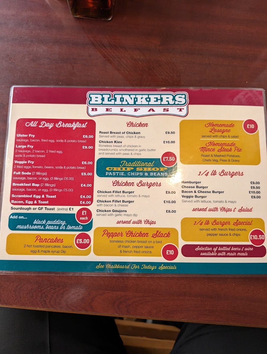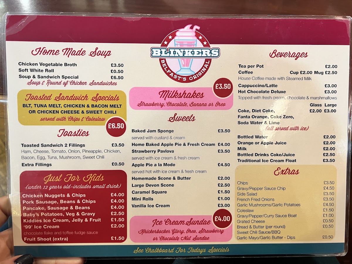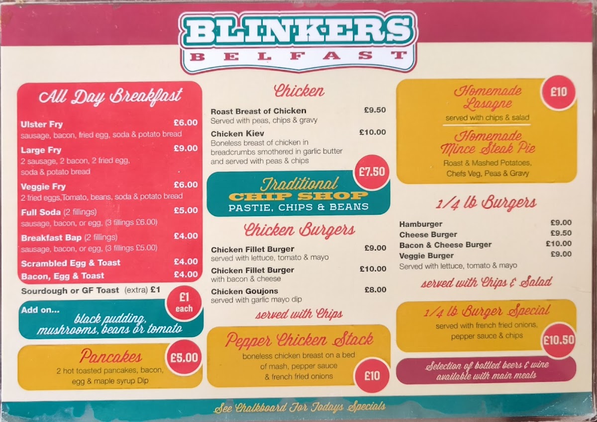 The menu at Blinkers offers a straightforward café-style experience, focusing on comforting, familiar dishes that suit any time of day. Whether you’re dropping in for a hearty breakfast, a casual lunch, or a warming snack, the selection features classic café fare alongside traditional English and Northern Irish specialties.